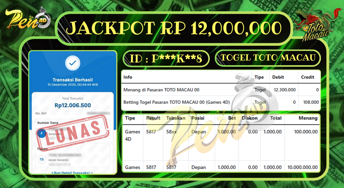 PEN4D $ Kemenangan Jackpot dan Bukti Pembayaran Withdraw Hari Ini 15 DESEMBER 2025