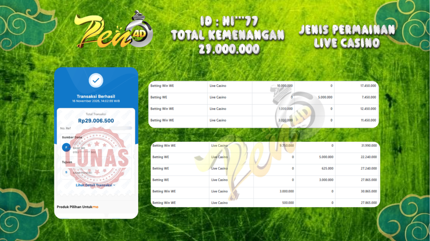Selamat Datang Di Platform Terkenal Pen4D, Berikut Kami Akan Menampilkan Seluruh Kemenangan Jackpot dan Bukti Pembayaran Withdraw Yang Di Dapatkan Oleh Seluruh Member Setia Kami.
